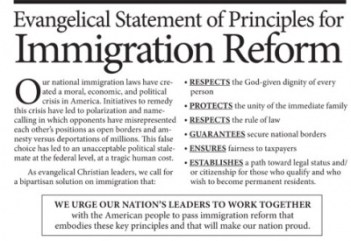The sixth is the one that distinguishes this statement from most conservative rhetoric on immigration policy (though the “and/or” language regarding citizenship softens the statement quite a bit). Still, the tone–and the list of names that signed the statement–mark a significant shift. The list features a wide range of evangelical perspectives including Jim Daly of Focus on the Family, Sojourners, Max Lucado, Russell Moore, Margaret Feinberg, J.D. Greear, and Timothy George. Organizations included World Relief, Bread for the World, the Southern Baptist Covention’s Ethics & Public Policy Center, Esperanza, the National Hispanic Christian Leadership Conference, and the National Association of Evangelicals.